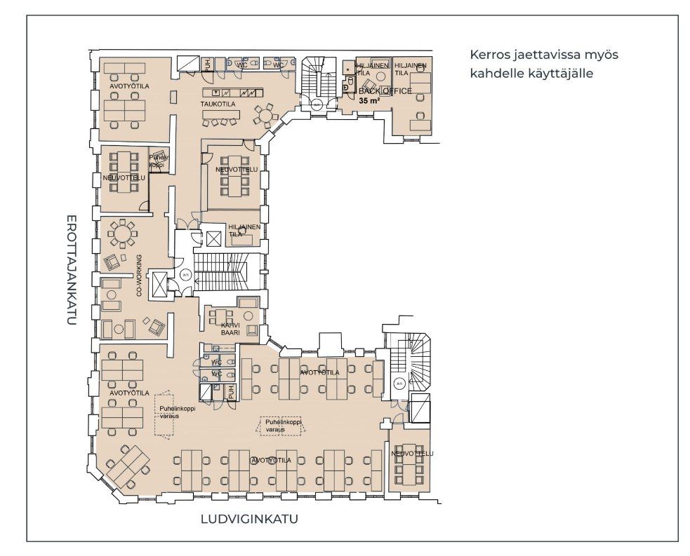 Toimisto on jaettavissa myös kahdelle käyttäjälle, ja tiloista löytyy monipuolisia ratkaisuja erilaisiin työskentelytapoihin, kuten tilat luovaan co-working-työskentelyyn.