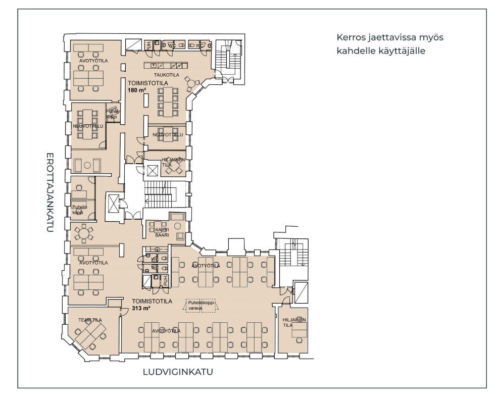 Toimisto on jaettavissa myös kahdelle käyttäjälle, ja tiloista löytyy monipuolisia ratkaisuja erilaisiin työskentelytapoihin, kuten tilat luovaan co-working-työskentelyyn.