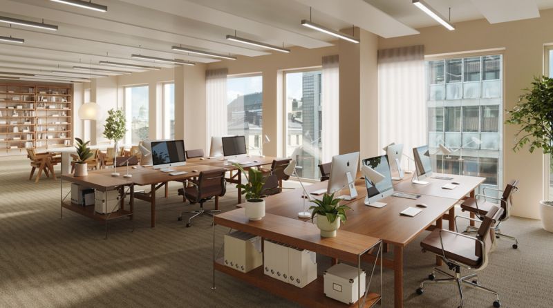 Kuvat ovat visualisointeja tulevasta kiinteistöstä. Visualisoinneissa esiintyy sisustusarkkitehtuurin ammattilaisten luomat design-teemat, joita on mahdollista hyödyntää toimistojen tilasuunnittelussa.