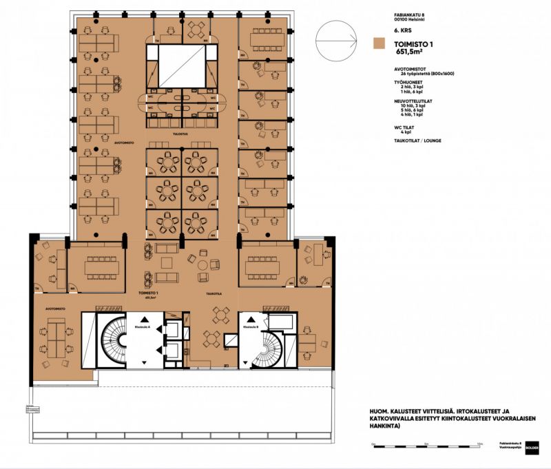 Vuokrataan toimistotilaa Fabianinkatu 8 kiinteistöstä. Kiinteistö saneerataan ja se valmistuu 2026 tammi-kesäkuun aikana. Kalustettu pohjakuva on esimerkkipohja 6. kerrokseen sovitetusta tilasta 651,5 m2. Visualisoinnit eivät ole kuvauksia yksityiskohdista tai väreistä.