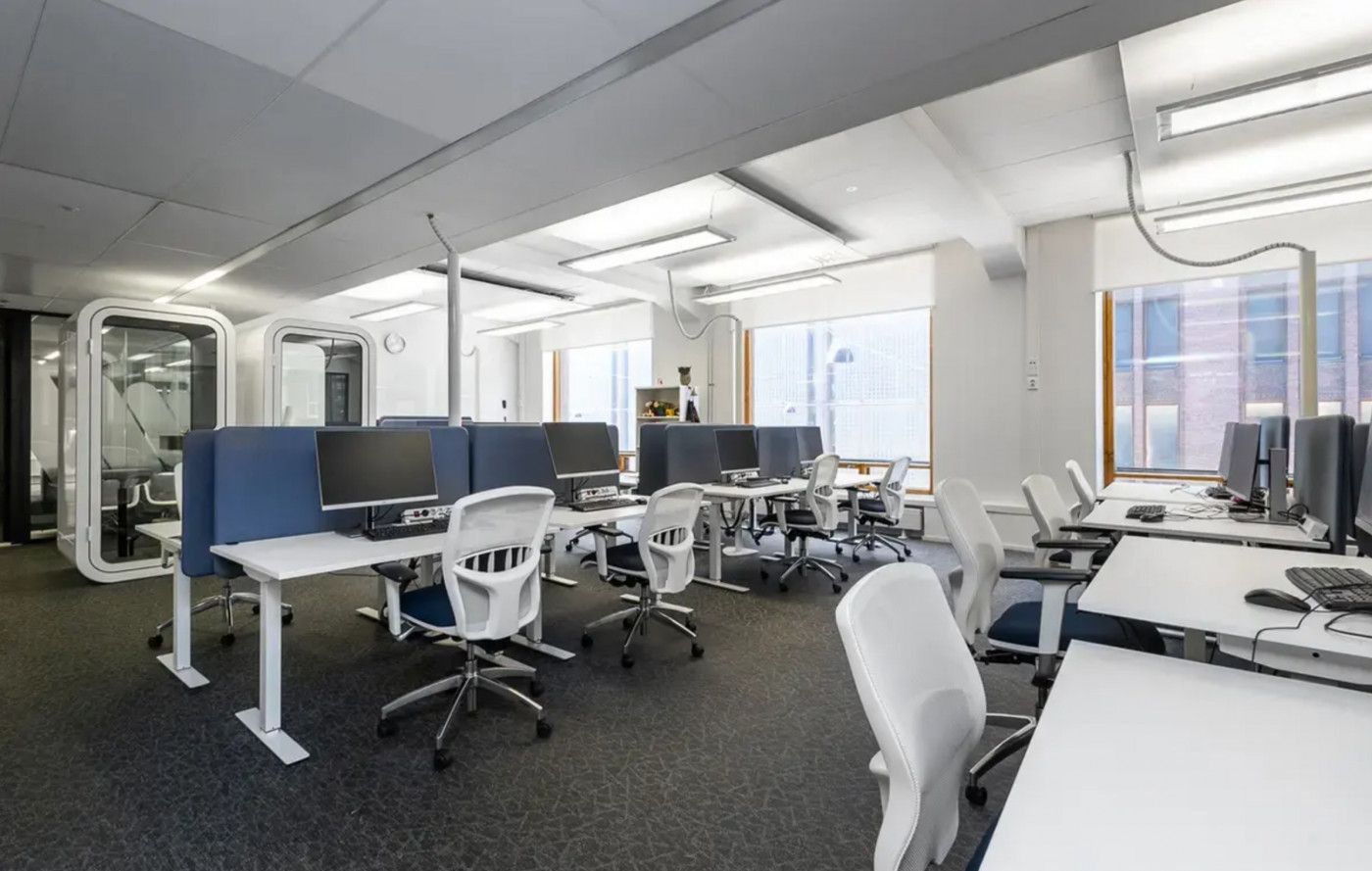 Ikkunoista tulviva luonnonvalo ja tilan käytännöllisyys tekevät tästä toimistosta paikan, jossa työnteko ei ole vain velvollisuus vaan myös