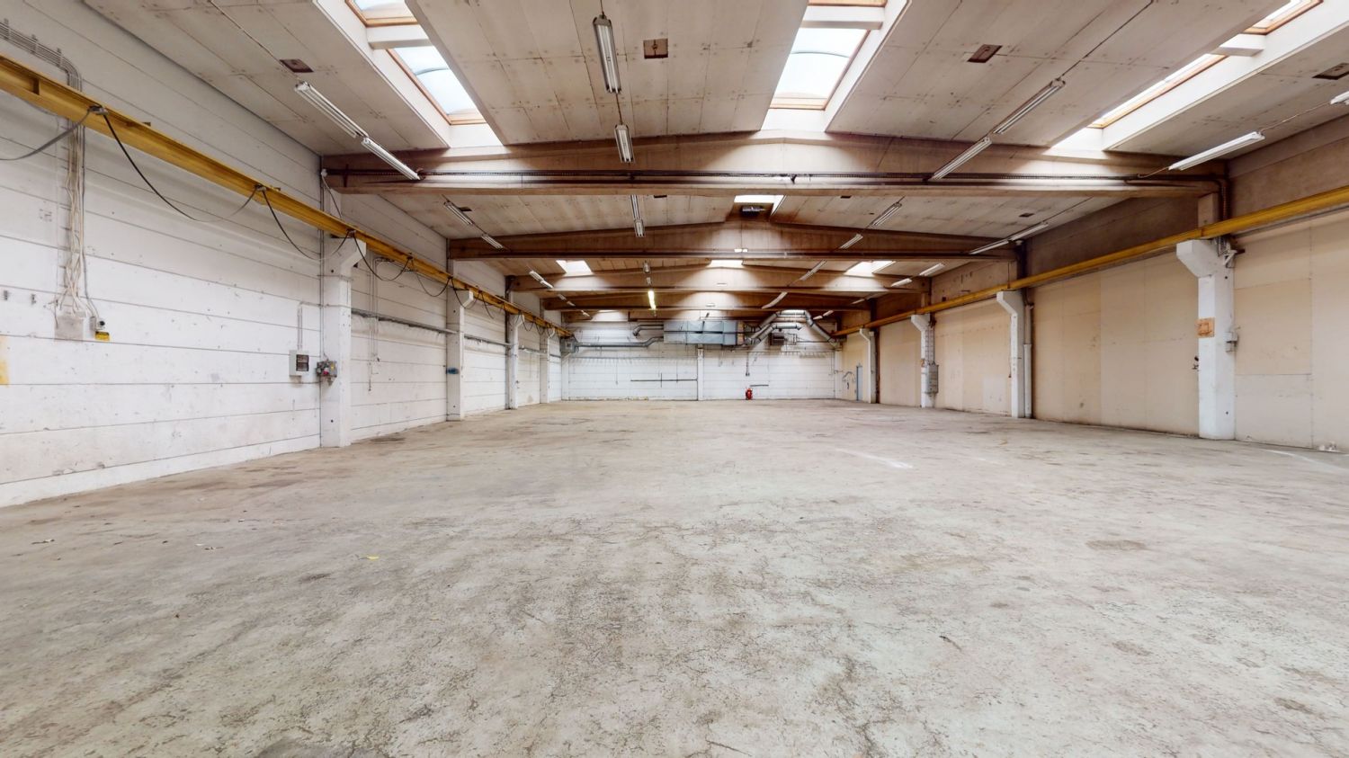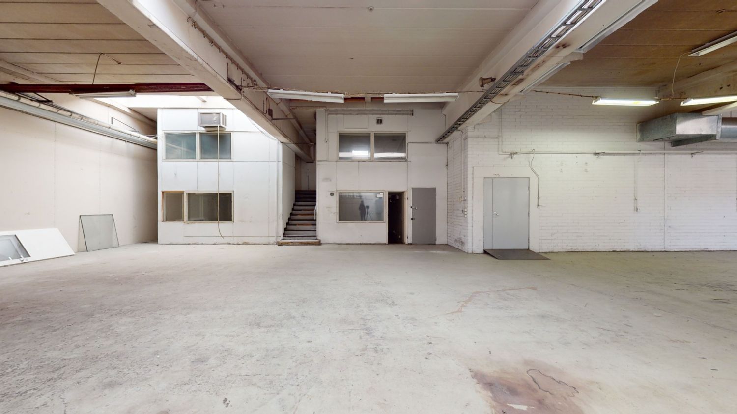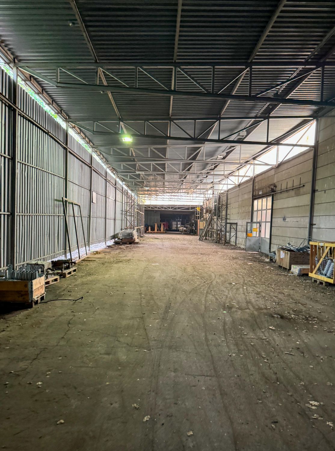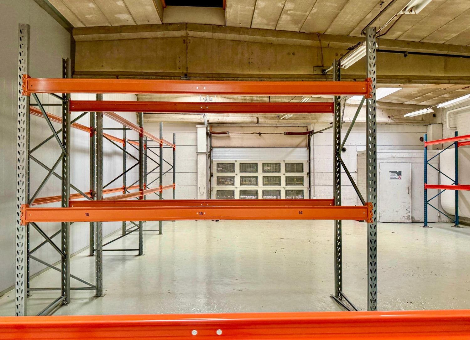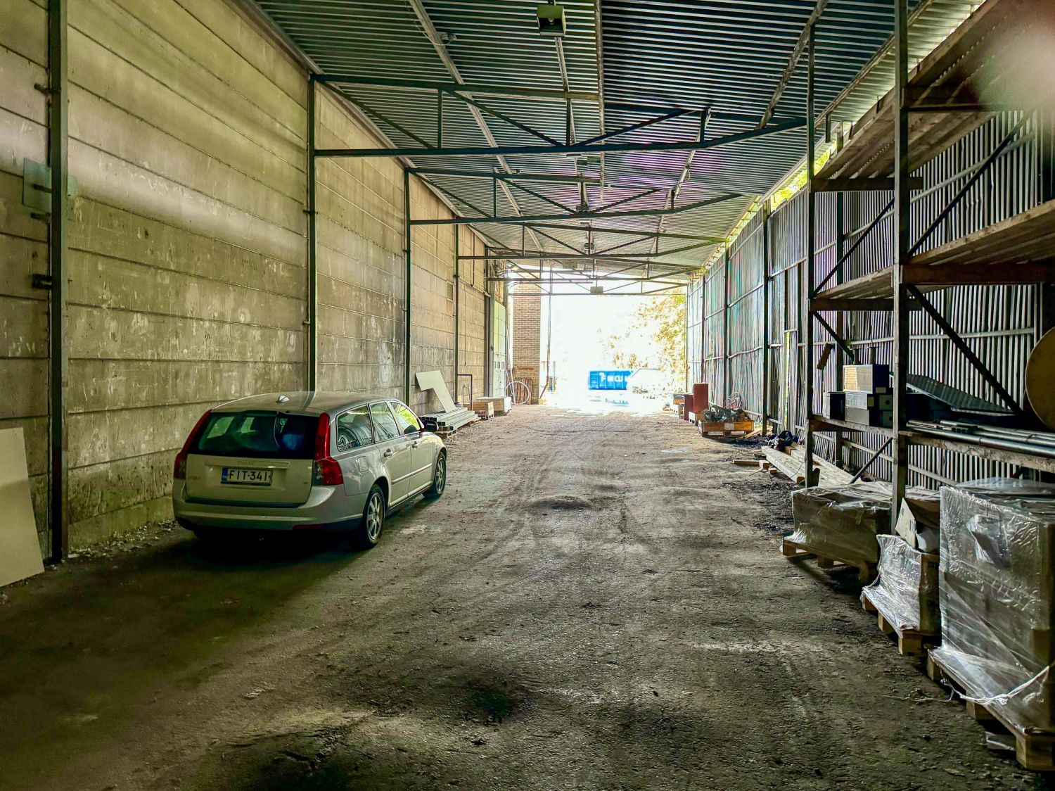 Varastohalliin on sisäänajomahdollisuus kahdesta ovesta. Tässä suhteellisen korkeassa tilassa on valmiiksi jo joitakin varastohyllyjä.