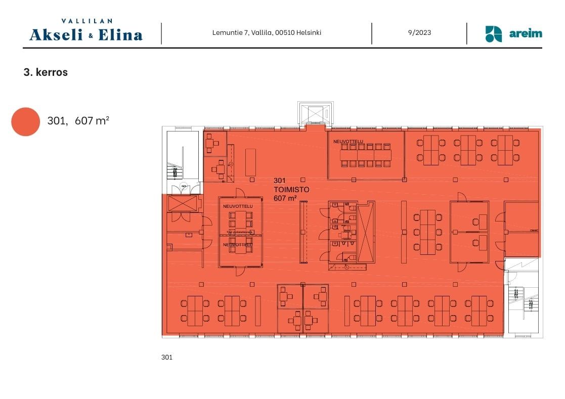 Kolmannen kerroksen toimisto erinomaisella sijainnilla Vallilassa. Tilan huonekorkeus on hieman tyypillistä toimistoa korkeampi, mikä luo tilalle valoisan ilmeen. Sopiva tasapaino avotilaa ja toimistohuoneita mahdollistaa tehokkaan työympäristön monenlaisille työntekijöille.
