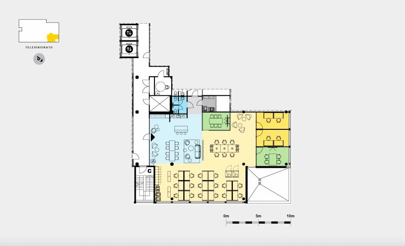 Toimistotila johon mahtuu vähintään 26 työpistettä, avotilassa 16 työpistettä, ja 6 hotdeskiä, lisäksi 2 kahden hengen huonetta. Neuvotteluhuoneet 4 ja 6 hengelle. Taukoistuintilaa 18 hengelle keittiön yhteydessä. Erittäin valoisa tila ikkunoidensa ansiosta, näkymät kahteen ilmansuuntaan. Tiloissa mm. tekstiilipalamatot, omat toimivat taukokeittiöt vinyylilankkulattioin, wc:t, energiatehokas led-valaistus.