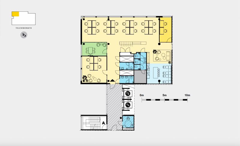 Toimistotila johon mahtuu vähintään 22 työpistettä, avotilassa 16 työpistettä, 4 hengen tiimihuone, Neuvotteluhuoneet 4:lle. Taukoistuintilaa 12 hengelle keittiön yhteydessä. TIloista rauhalliset ikkunanäkymät ulos vastapäiseen rakennukseen. Kaikissa tiloissa mm. tekstiilipalamatot, omat toimivat taukokeittiöt vinyylilankkulattioin, wc:t, energiatehokas led-valaistus.