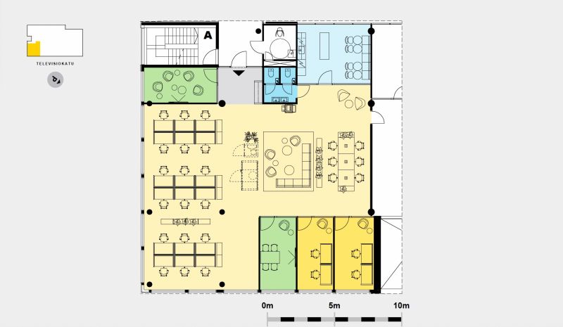 Toimistotila johon mahtuu vähintään 28 työpistettä, avotilassa 18 työpistettä ja 6 hot deskiä, lisäksi 2 kahden huonetta. 2 neuvotteluhuonetta, kumpikin 4:lle. Taukoistuintilaa 8 keittiön yhteydessä ja avotilassa 11 hengen kohtaamistila. TIloista avarat näkymät kohti itää ja etelään ja vastapäistä rakennusta. Kaikissa tiloissa mm. tekstiilipalamatot, omat toimivat taukokeittiöt vinyylilankkulattioin, wc:t, energiatehokas led-valaistus.