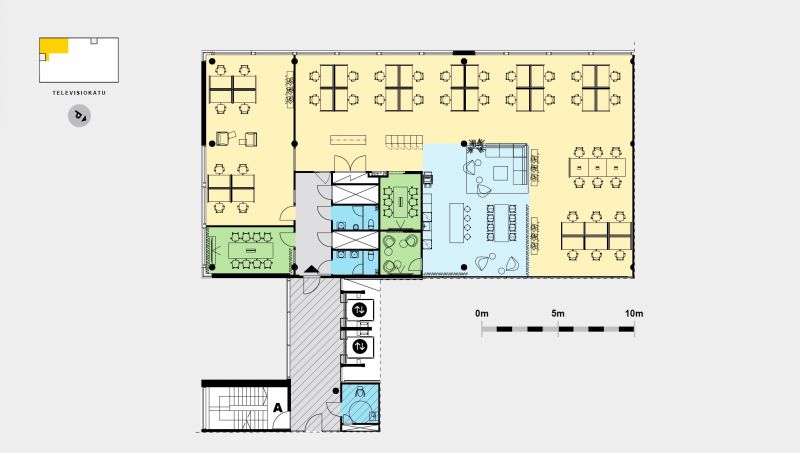 Toimistotila johon mahtuu n. 40 työpistettä, kaksi avoaluetta, neuvotteluhuoneet 8 ja 6 hengelle. Pieni vetäytymistila ja iso yhteinen taukotila ja lounge