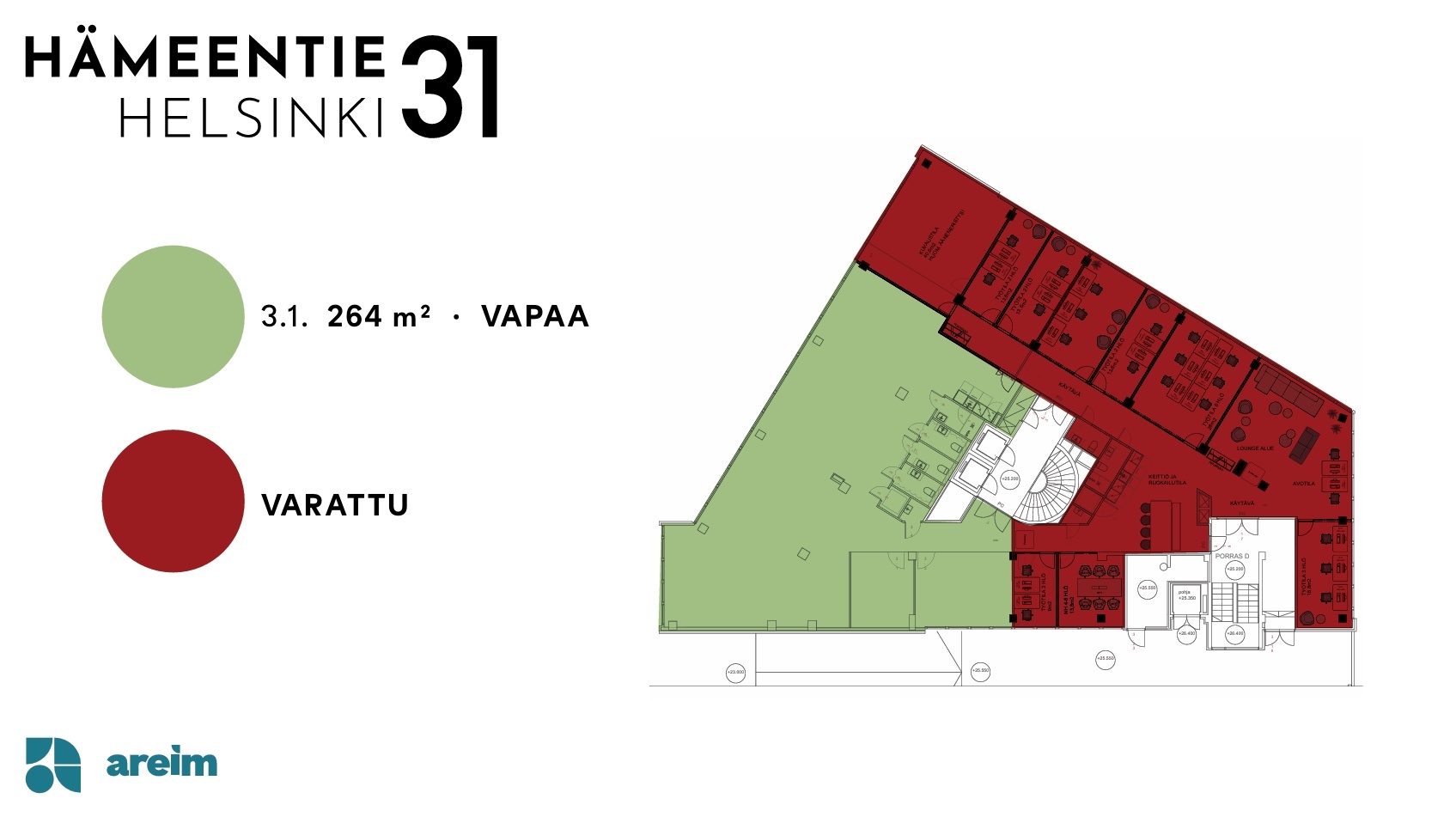 Hämeentie 31:n kiinteistö on perinteikäs liikekiinteistö, joka on saanut 2020-luvulla uuden elämän. Kiinteistön ilmanvaihto ja talotekniikka on uusittu hiljattain taaten raikkaan sisäilman ja hyvän työvireen. Taloon on remontoitu moderneja ja muunneltavia toimitiloja, jotka täyttävät vaativammatkin tarpeet. Suurista ikkunoista aukeaa avarat näkymät naapuruston puistoihin ja kaupungin kattojen ylle.