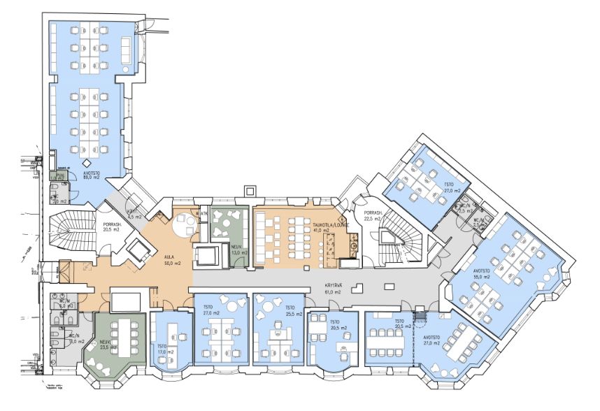 Tämä 539 m² toimistotila sijaitsee kiinteistön 2. kerroksessa. Jugendrakennuksessa on korkeat huoneet, avotoimistotilaa ja moderni jäähdytys. Talon monipuoliset palvelut ovat yrityksesi tukena. Kuvat ovat yleiskuvia kiinteistön tiloista.