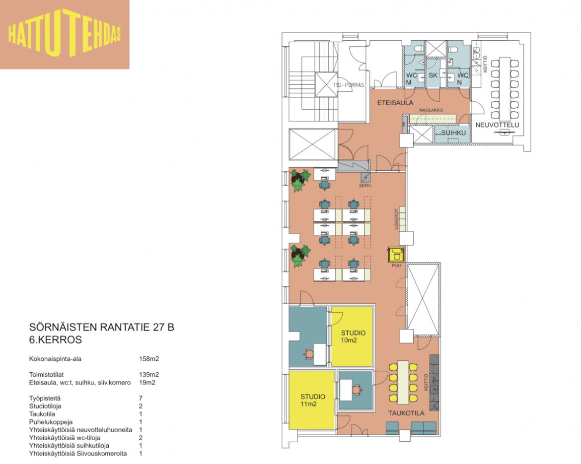 Rakennuksessa on kaikkia vuokralaisia palveleva lounasravintola sekä useita vuokrakäyttöön tarkoitettuja kokous- ja neuvottelutiloja. Eloa Hattutehtaaseen tuovat talon yhteydessä toimivat myymälät, kahvila ja kuntosali. Kohde sijaitsee helppojen julkisten yhteyksien varrella. Autopaikkoja saatavilla sekä hallissa että pihalla. Tila remontoidaan vuokralaisen tarpeisiin.