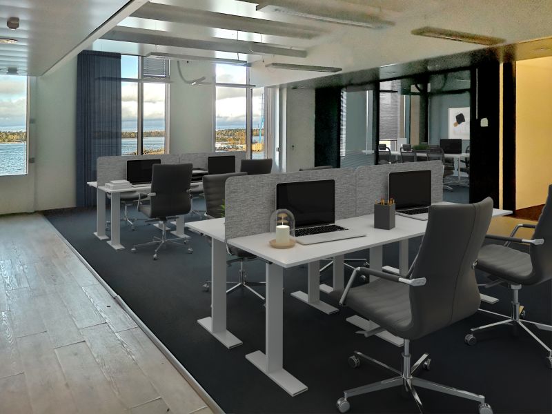 Ensimmäisestä kerroksesta valoisa ja korkea avotilatoimisto. Toimistosta on upeat merinäköalat ja lattia on vasta uusittu. Ilmoituksen virtuaalistailatut kuvat ovat yleiskuvia kiinteistön eri tiloista.