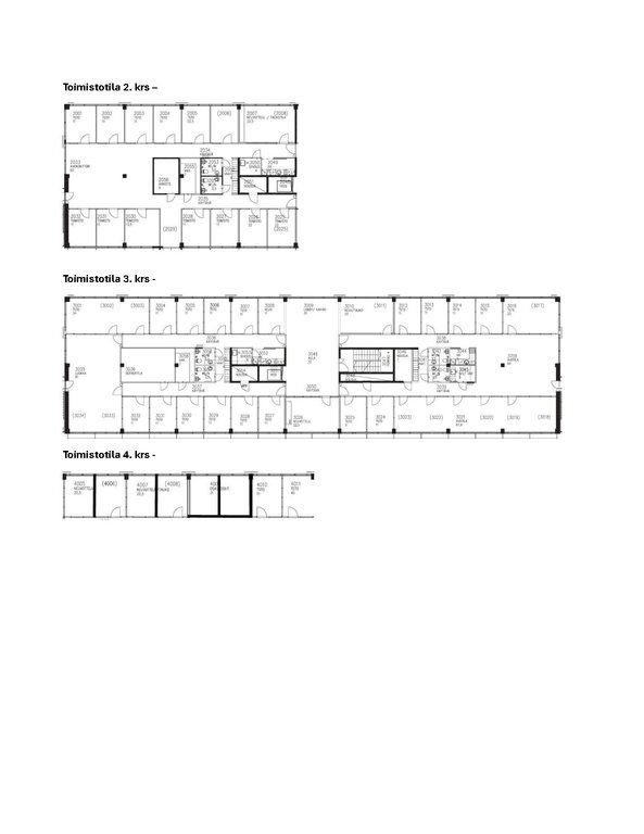 Tämä 1555 m² toimistotila jakautuu kiinteistön 2., 3. ja 4. kerrokseen. Kerrokset ovat pääosin huoneellisia, ja niihin kuuluvat omat keittiö- ja wc-tilat. Tiloja on mahdollista vuokrata useammalle käyttäjälle. Vapautuminen 1.1.2026.