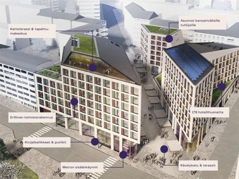 Erinomainen ja helposti saavutettava sijainti Hakaniemen metroaseman yllä, raitiovaunu- ja bussipysäkkien vieressä.