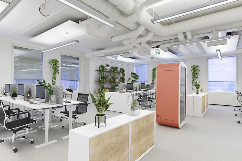 Toisen kerroksen siisti toimisto merellisistä maisemista, Technopolis Ruoholahti 3-rakennuksesta.