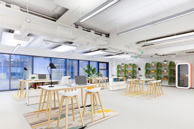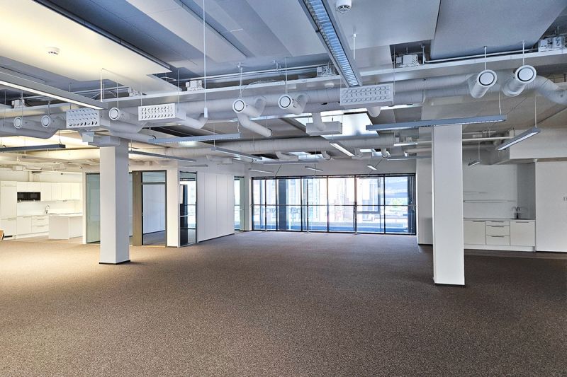 Toisen kerroksen siisti toimisto merellisistä maisemista, Technopolis Ruoholahti 3-rakennuksesta.