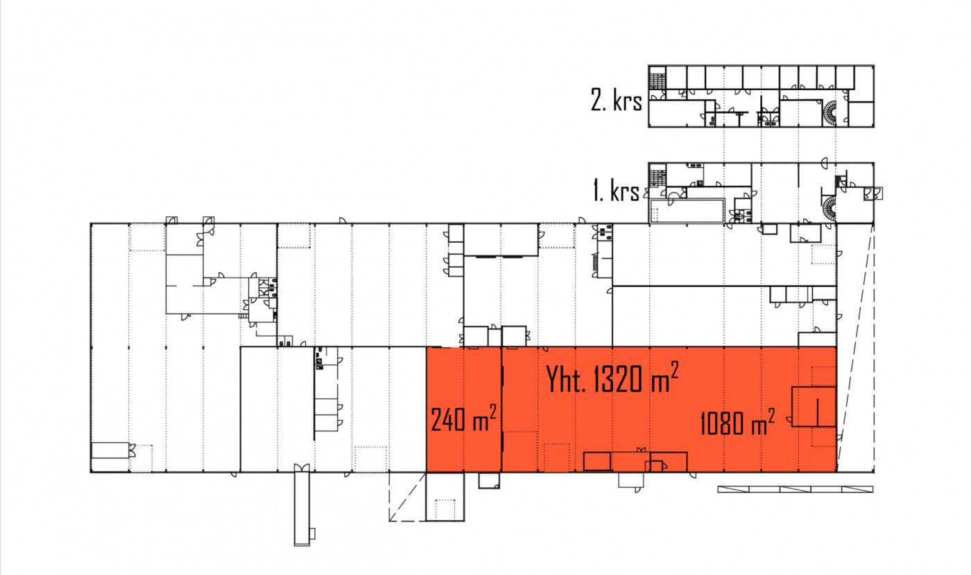 Vuokrataan tuotanto/teollisuus- tai varastotila 1320 m², jossa erillinen väliseinällä kahteen osaan jaettu toimistotila 44 m² sekä keittiönurkkaus ja wc. Lisäksi 125 m² toimistotilaa vuokrattavissa erikseen toimistosiivestä.