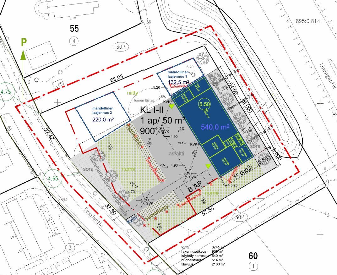 Tontin rakennusoikeus kokonaisuudessaan 900 m2, rakennuksen pinta-ala 540 m2. Rakennusoikeutta on käyttämättä 360 kem2.
