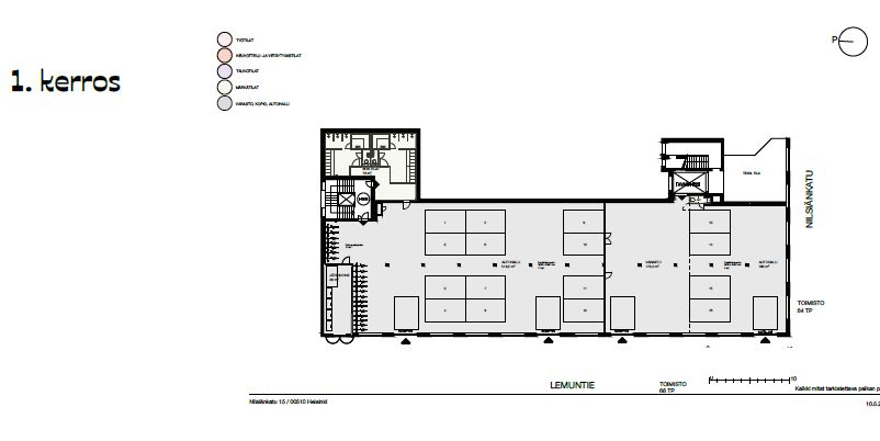 1. kerroksessa on varasto ja tuotantotilaa sekä autohalli, joiden yhteispinta-ala on 880 m². Tuotanto- ja varastotilaa on noin 440 m².