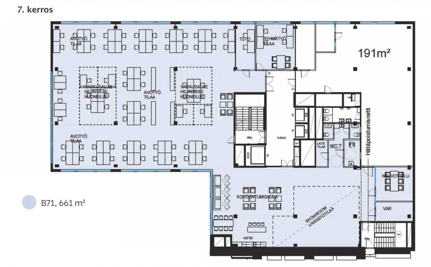 Vuokrataan seitsemännen kerroksen 661m2 toimistotila, joka on muokattavissa juuri sellaiseksi että se palvelee yrityksen tarpeita optimaalisesti. Modernit puitteet klassikkotalossa ovat inspiroiva työympäristö, niin työntekijöille kuin asiakkaillekin. Kiinteistössä on Fazerin lounasravintola- ja kahvilakonsepti Ravintola Kravattitehdas. Talossa on eri kokoisia kokoustiloja ja auditorio (60-70 hlö) uudistettu 2018. Kiinteistössä myös sähköauton latauspiste. Tulossa lainapolkupyöriä. Autopaikkoja on yhteensä 176. Naapuritontilla on Q-Park Vallila, jossa on 700 pysäköintipaikkaa Julkisen liikenteen osalta raitiovaunu- ja bussipysäkkejä löytyy muutaman sadan metrin päästä, lähimmät raideliikenteen asemat puolestaan Pasilasta (juna) ja Sörnäisistä (metro).