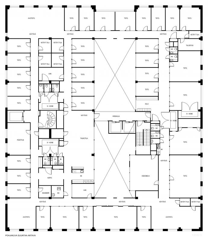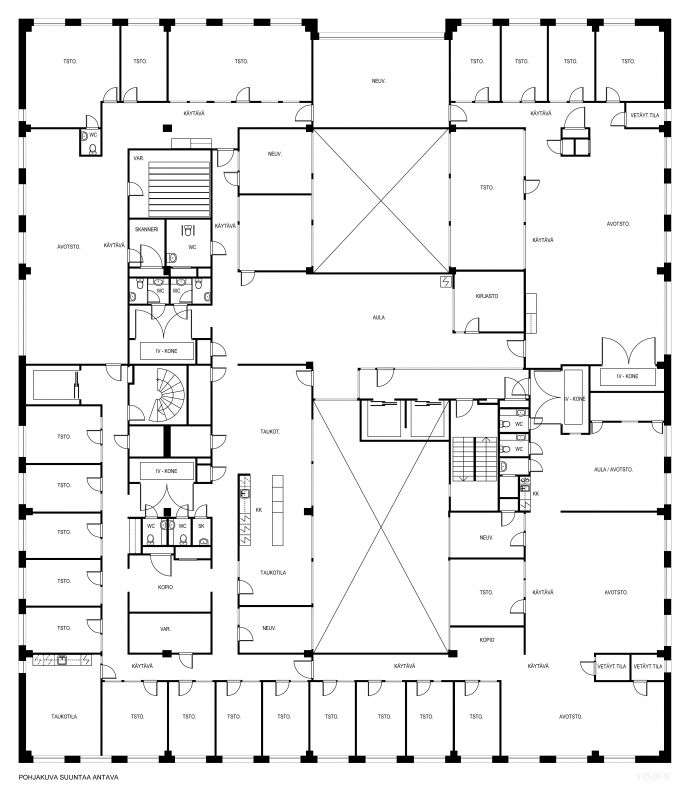 Toimistotilassa on neuvotteluhuoneita, eri kokoisia toimistohuoneita, avotilaa, Keittiöt, sosiaalitilat ja wc:t. Koko kerroksen vuokralaisella on myös oma hissiaula sekä tavarahissi käytössä josta pääsee suoraan rakennuksen takana olevalle lastauslaiturille.