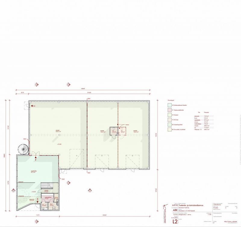 Kiinteistön seinärakenne Parocin 240 mm pelti-villa-pelti elementti. Tilassa lattialämmitys sekä lattiakaivot. Kahdet nosto-ovet.