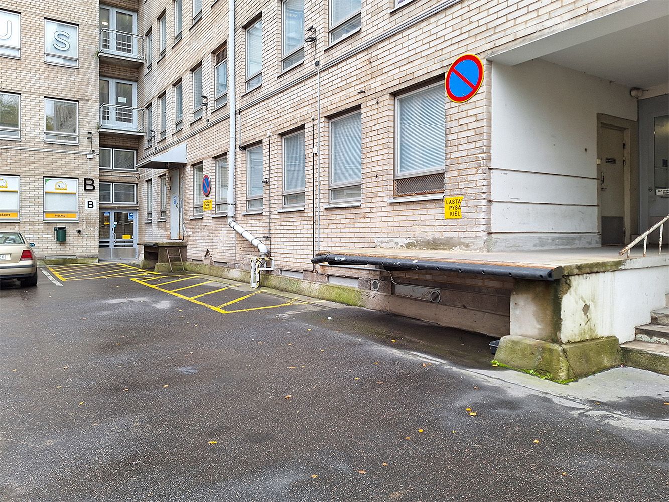 Rakennuksen katutasossa on kapea ja osittain katettu lastauslaituri. Laiturin lastauskorkeus on noin 1 m. Purku- ja lastausalue on aavistus ahdas ja siihen mahtuu kerrallaan yksi kuorma-auto purkamaan.