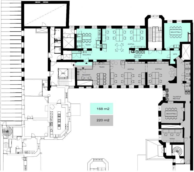 Toimistokokonaisuus kattaa kaksi huoneistoa 168 m2 ja 220 m2 jotka on mahdollista vuokrata erikseen tai yhdessä jolloin koko toimistopinta-ala on 338 m2.