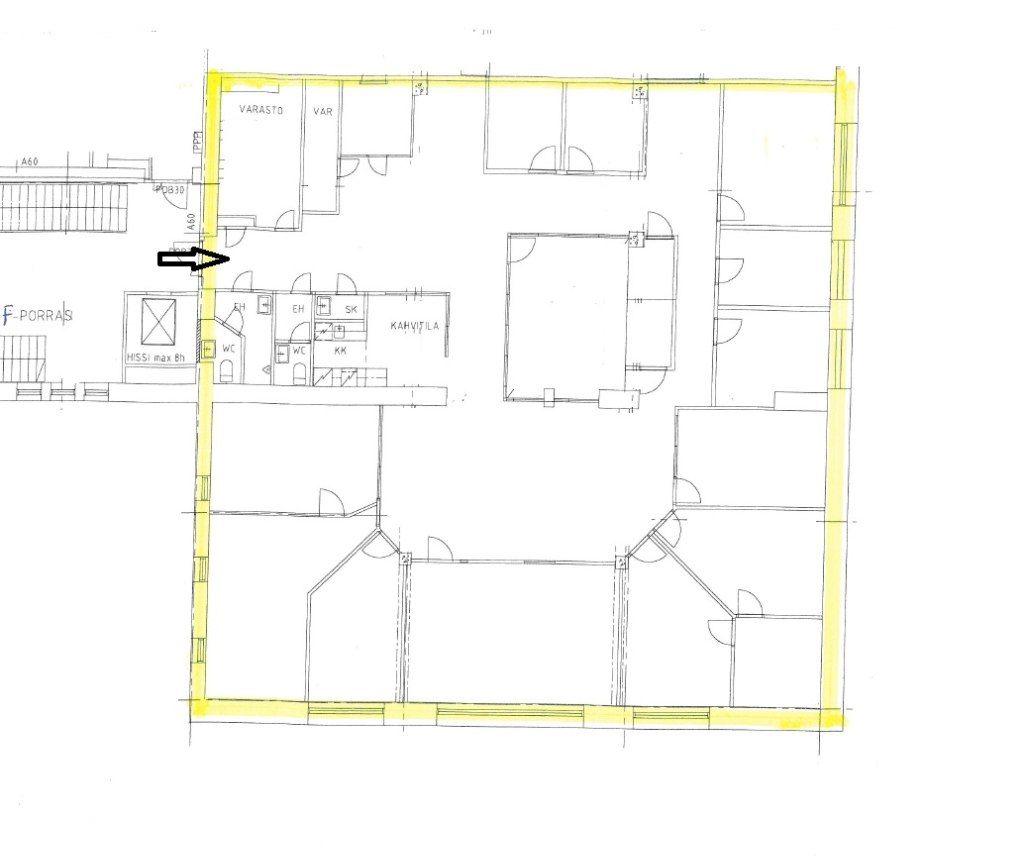 Rapussa hissi ja luiska. Tilan koko on 406 m2. Se koostuu avotilasta, useista erikokoisista huoneista ja keittiö- sekä wc-tiloista. Yhdessä sosiaalitilassa on paikat esim. pyykinpesukoneille. Mukavat näkymät ikkunoista kolmeen eri suuntaan.