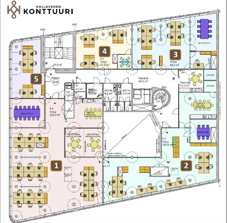 Tämä 99,5m2 toimistotila sijaitsee kiinteistön 5. kerroksessa. Toimistossa on avotilaa, neuvotteluhuone ja työhuone. Wc-tilat ja keittiö ovat vuokralaisten yhteiskäytössä. Kerroksen peruskorjaus valmistui vuonna 2022. Tämä toimisto on pohjakuvassa tila 3.