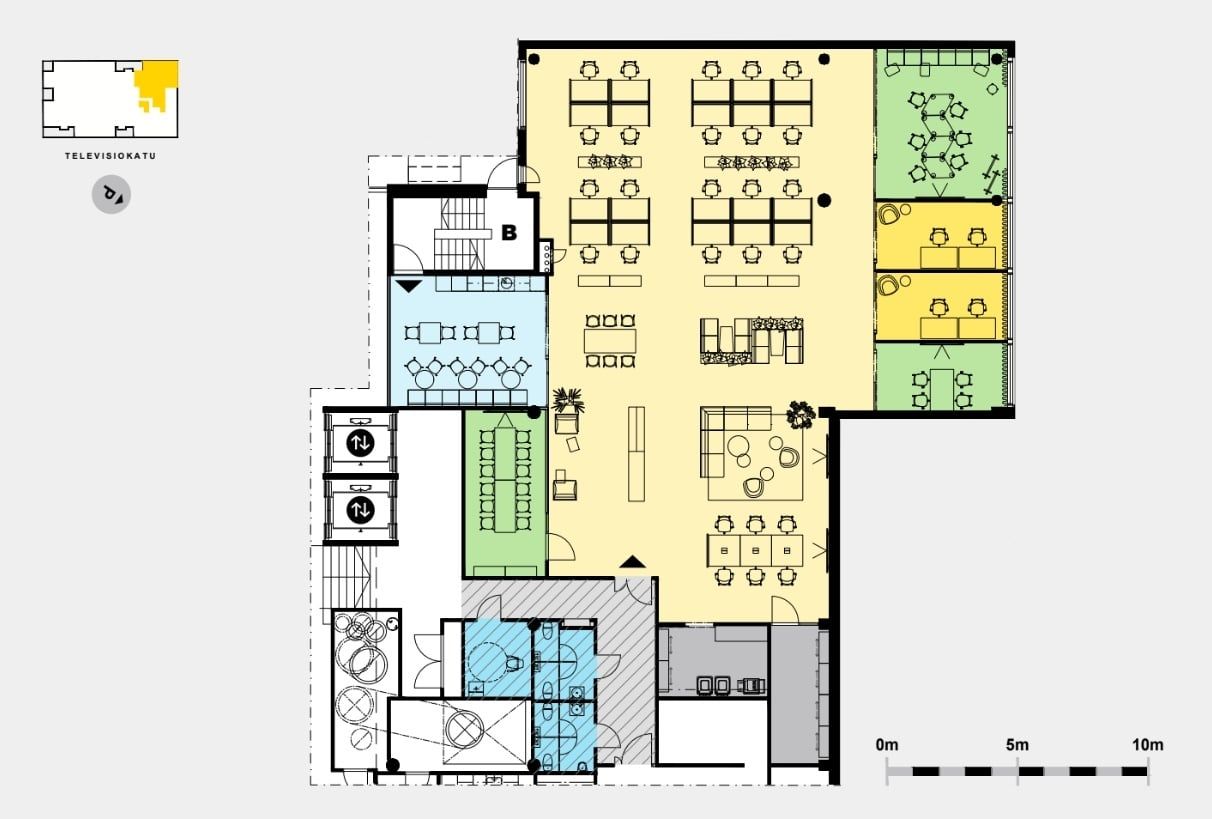 Ensimmäisen kerroksen monipuolinen toimistotila. Avotilaa täydentävät työ- ja tiimihuoneet sekä neukkari. Iso taukotila mahdollistaa kahvihetket kollegoiden kanssa. Wc-tilat ovat yhteiskäytössä naapuritoimiston kanssa, mutta tilaan on mahdollista toteuttaa myös omat wc:t.