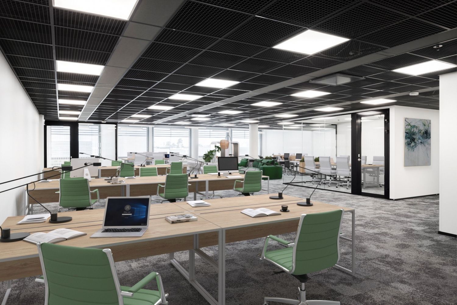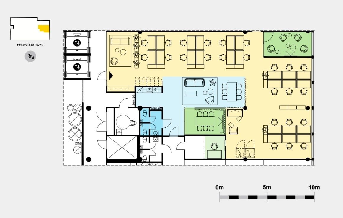 Muuttovalmis toimistotila 3C2 tarjoaa toimivan kokonaisuuden jopa 24 työpisteelle avotilassa. Tilasta löytyy lisäksi 4 ja 6 hengen neuvotteluhuoneet, noin 10 hengen taukoalue modernin cafe-keittiön yhteydessä, erillinen vetäytymistila sekä edustava sisääntulolounge. Varusteluun kuuluvat tekstiilipalamatot, laadukkaat taukokeittiöt vinyylilankkulattioilla, wc-tilat ja energiatehokas LED-valaistus. Sähkö veloitetaan 0,65 €/m²/kk ja aulapalvelu laskutetaan erikseen.