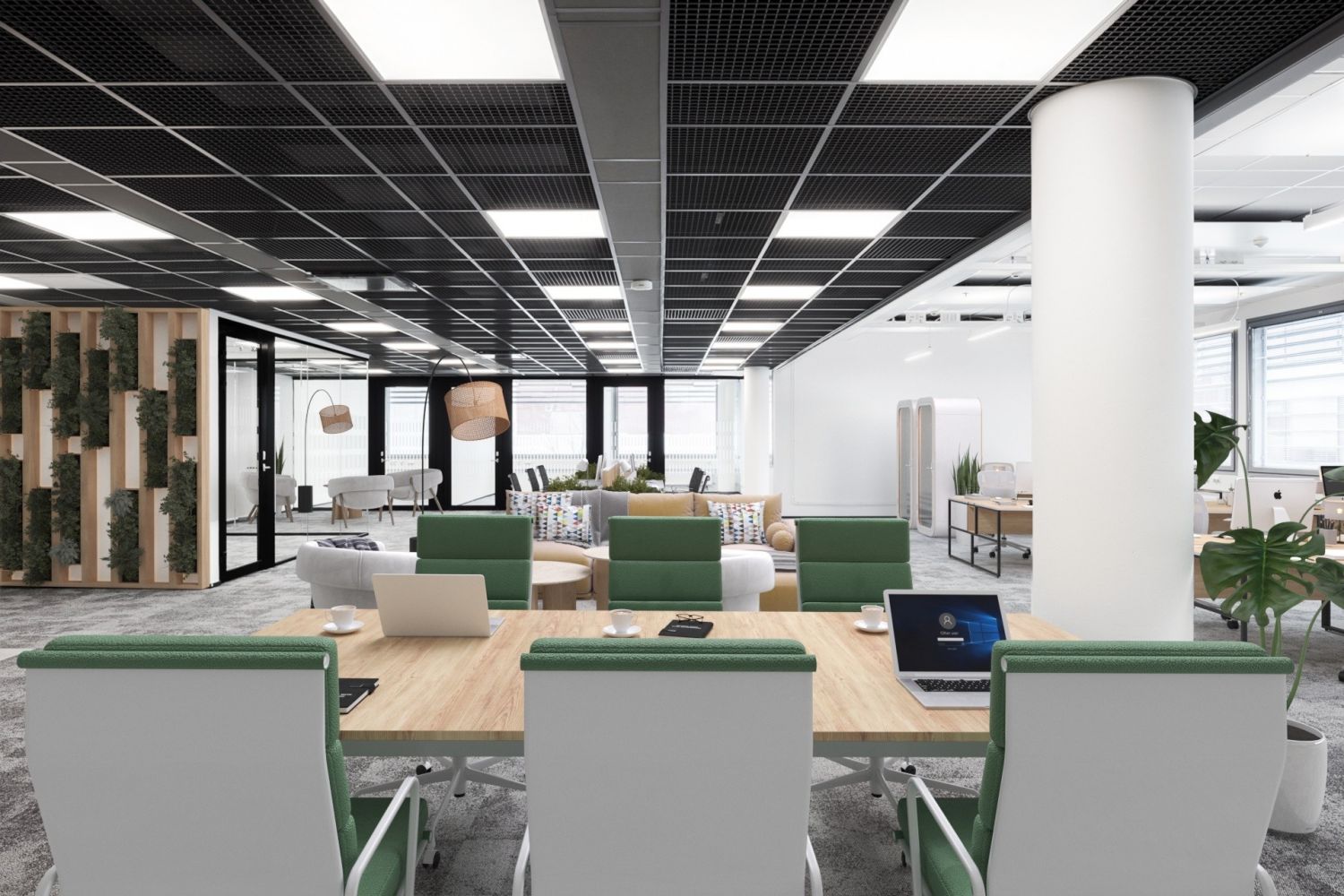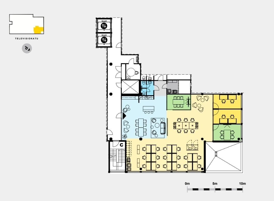 Muuttovalmis toimistotila 3C3 tarjoaa tehokkaat puitteet vähintään 26 työpisteelle: avotilassa 16 työpistettä ja 6 hot desk -paikkaa sekä lisäksi kaksi kahden hengen työhuonetta. Tilasta löytyy myös 4 ja 6 hengen neuvotteluhuoneet sekä 18 hengen taukoalue modernin cafe-keittiön yhteydessä. Runsaiden ikkunoiden ansiosta tila on erittäin valoisa, ja näkymät avautuvat kahteen ilmansuuntaan. Varusteluun kuuluvat tekstiilipalamatot, laadukkaat taukokeittiöt vinyylilankkulattioilla, wc-tilat ja energiatehokas LED-valaistus. Sähkömaksu on 0,65 €/m²/kk, ja aulapalvelumaksu veloitetaan erikseen.