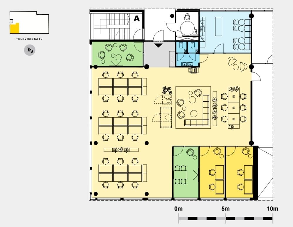 Muuttovalmis toimistotila 3A1 tarjoaa tehokkaan ja viihtyisän kokonaisuuden vähintään 28 työpisteelle, joista 18 sijoittuu avotilaan ja 6 hot desk -paikoille. Lisäksi tilassa on kolme vetäytymistilaa keskittymistä vaativaan työskentelyyn. Modernin kahvilakeittiön yhteydessä sijaitseva tauko- ja kohtaamisalue luo luontevan paikan yhteistyölle ja hengähdyshetkille. Ikkunoista avautuvat valoisat näkymät itään ja etelään. Varusteluun kuuluvat tekstiilipalamatot, vaaleasävyiset taukokeittiöt vinyylilankkulattioilla sekä energiatehokas LED-valaistus. Sähkömaksu on 0,65 €/m²/kk ja aulapalvelumaksu veloitetaan erikseen.