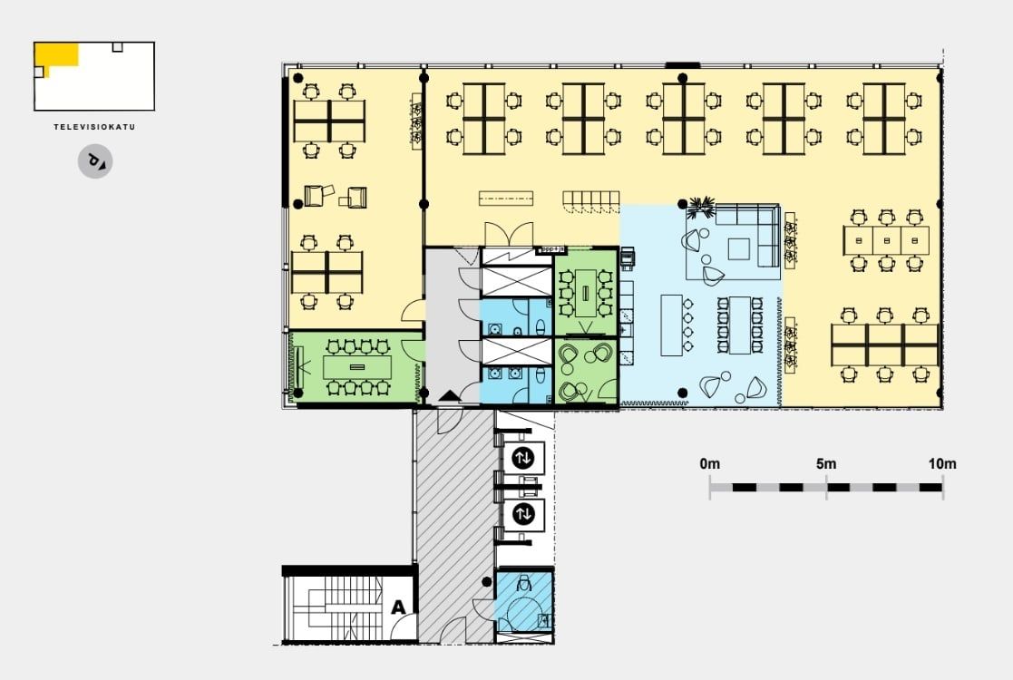 Valoisa kulmahuoneisto avoimella pohjaratkaisulla. Avokonttoria täydentää reilun kokoinen tiimihuone sekä kolme neuvottelutilaa. Tilan sydämenä toimii avoin taukotila, joka tarjoaa viihtyisän ympäristön kahvihetkelle kollegan kanssa.