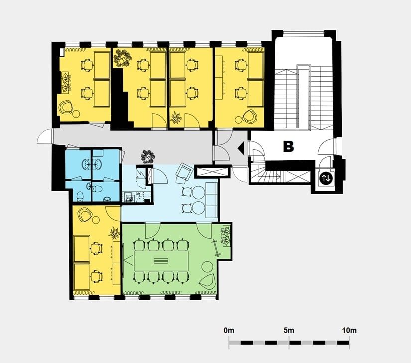 Kuudennen kerroksen toimisto hyvällä pohjaratkaisulla yksityisyyttä vaativaan työhön. Tilassa on viisi työhuonetta sekä neukkari. Tilan keskiössä on pieni taukotila.