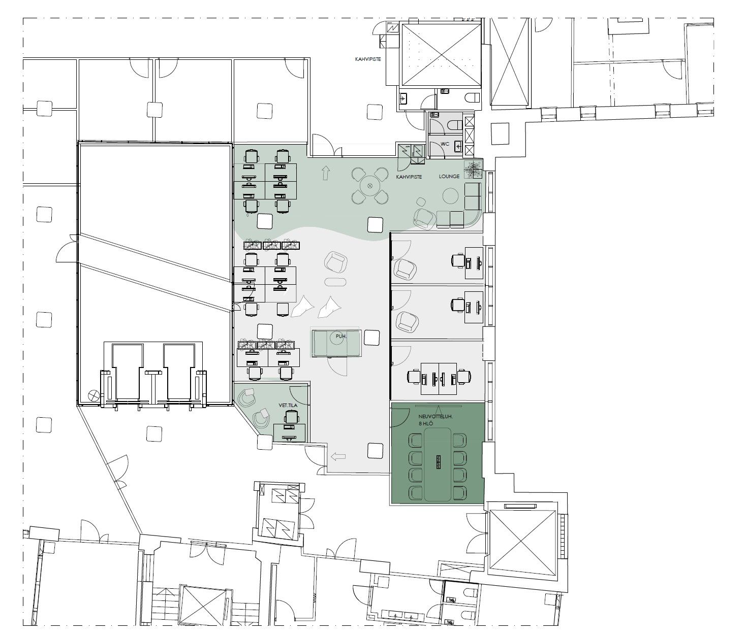Huonetoimisto (8 kpl) sijaitsee Fabrik Studios -alueen vieressä. Yhteiskäyttöiset keittiö-lounge-(sisältää astiat, kahvin- ja vedenkeittimen) pientoimistoalueen kanssa. Yhteisten alueiden siivous, aulapalvelu sekä kuntosalin käyttöoikeus sisältyvät vuokraan.