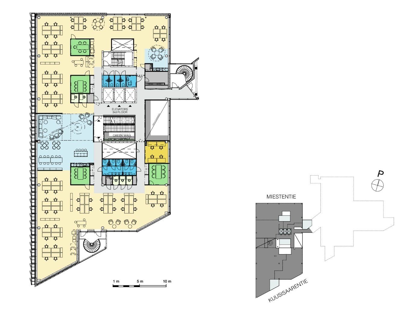 Työmatkapyöräilijät pääsevät ajamaan ramppia pitkin lämpimään pyöräparkkiin, jonka välittömässä läheisyydessä sijaitsevat huippuluokan suihku- ja pukeutumistilat. Liikkumiseen kannustavat myös kuntosali ja liikunta- ja hyvinvointitilat. Kaikki toimistotilat voidaan toteuttaa yrityksen tarpeen mukaisesti. Aulapalvelu, viihtyisä lounge sekä lounasravintola sijaitsevat avaran pääaulan läheisyydessä. Ensimmäisestä kerroksesta löytyvät edustavat kokous- ja neuvottelutilat laadukkain catering-palveluin.