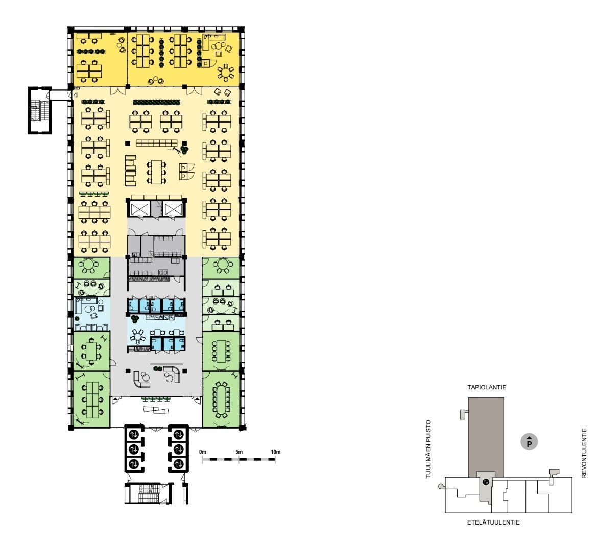 Koko siiven suuri toimistotila jopa 88 työpisteellä. Valoisassa tilassa on ikkunat kolmeen ilmansuuntaan. Toimisto ilman seinänaapureita on rauhallinen työympäristö. Tilassa 6 neuvotteluhuonetta, 4 vetäytymistilaa ja näyttävä cafe/lounge. Tila remontoidaan käyttäjän tarpeiden mukaan, mahdollisuus toimistohuoneisiin.