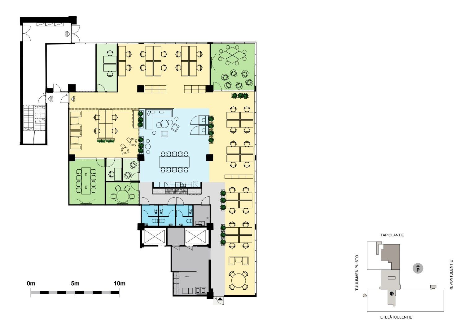 Katutason moderni monitilatoimisto, jonne niin työntekijöiden kuin asiakkaiden on helppo saapua. Tilassa on kaksi neuvotteluhuonetta, kolme vetäytymistilaa ja cafe/lounge. Tila remontoidaan käyttäjän tarpeiden mukaan. Ikkunat kahteen ilmansuuntaan.