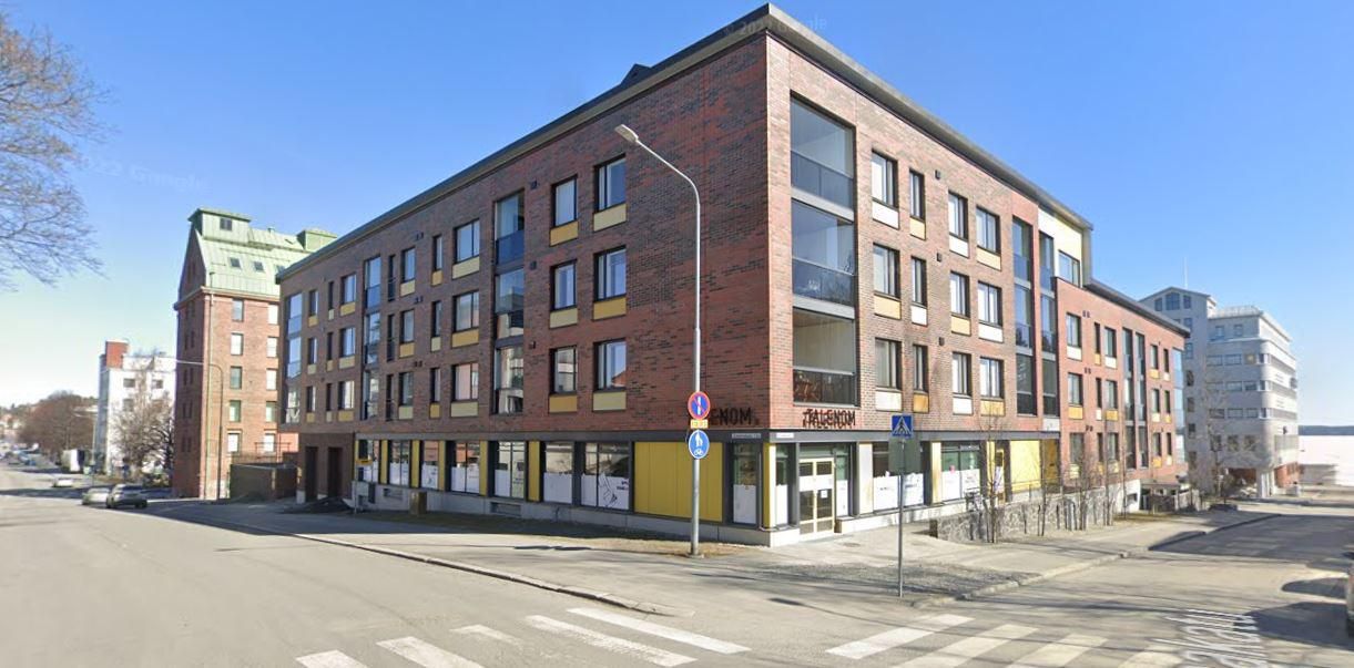 Isot julkisivulla olevat ikkunat tuovat valoisuutta sisätiloihin ja asiakkaiden pääsisäänkäynti on kadun kulmassa.