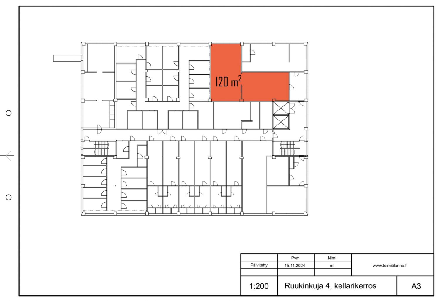 Vuokrataan 120 m2 varastotilaa rakennuksen kellarikerroksesta, jonne pääsee myös tavarahissillä. Varasto koostuu kahdesta liukuovella erotetusta alueesta. Tilassa on vanha keittiö, joka voidaan tarvittaessa purkaa.