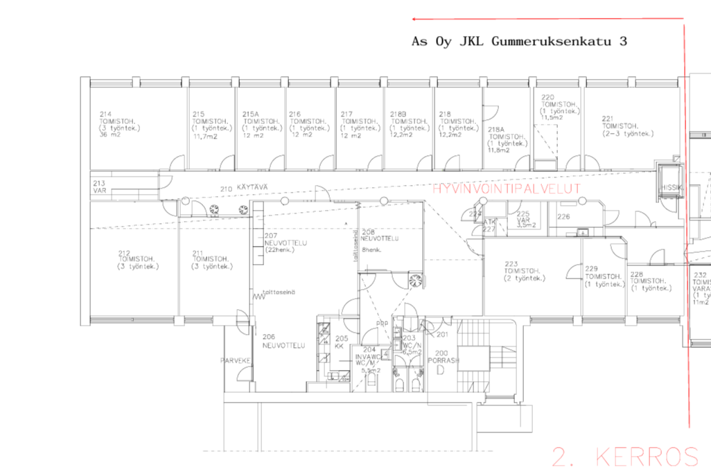 Vuokrataan 460 m2 toimistotilaa hyvältä paikalta Jyväskylän keskustasta, Vapaudenkadulta. Toisen kerroksen toimistotiloissa on 15 työhuonetta, joiden koko vaihtelee välillä 11,5 - 36 m2. Kolme neuvotteluhuonetta, joissa on tilaa 2-22 henkilölle. Sen lisäksi kokonaisuuteen kuuluu keittokomero sekä 2 kpl WC. Tiloissa on myös kaksi varastoa (2 x 3,5 m2). Lisäksi parveke vanhan pappilan suuntaan.