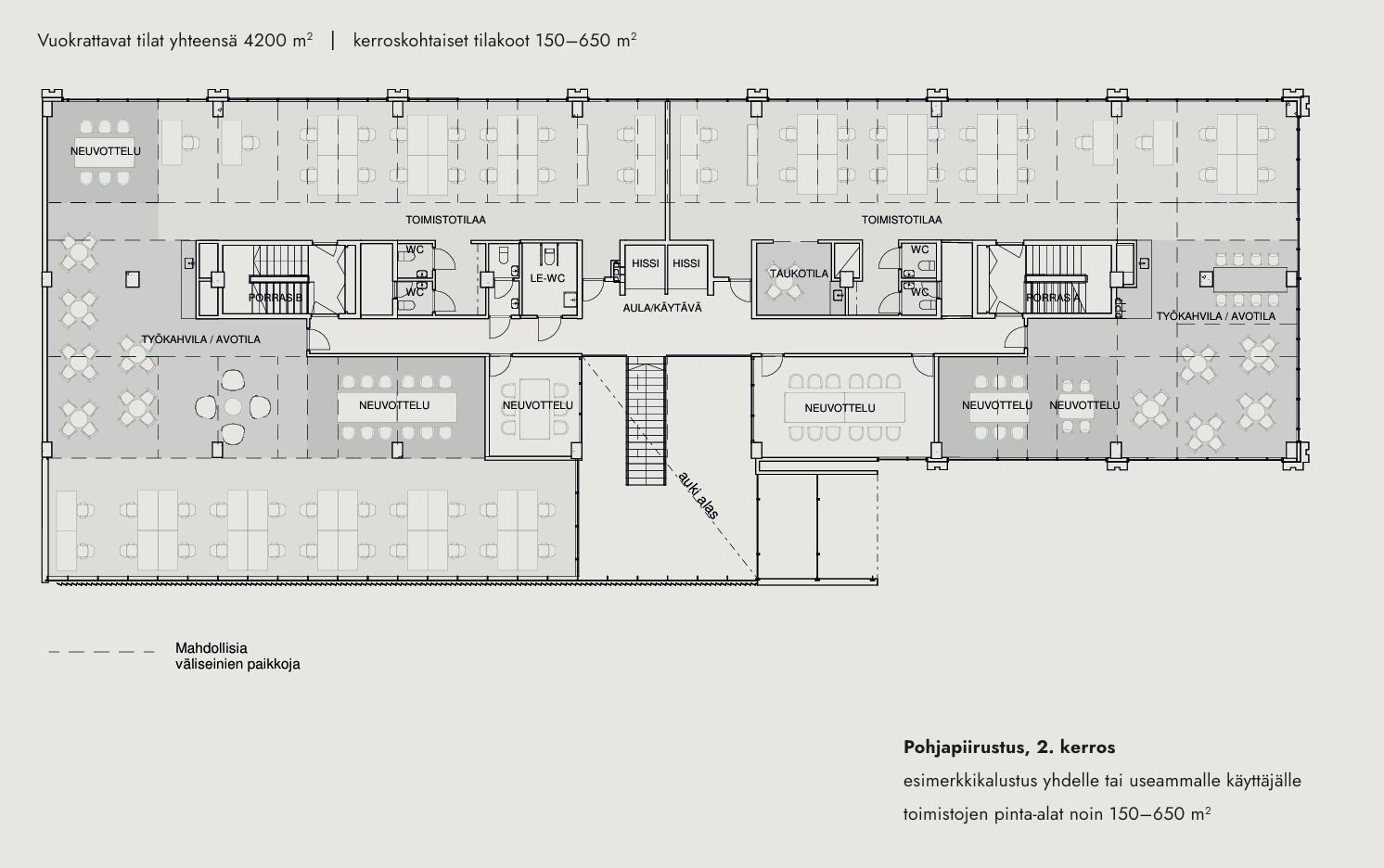 Kiinteistön upouusia toimitiloja löytyy kokoluokassa 150-650 m2. Rakennuksen kerrokset voidaan muokata helposti 1-4 toimijan käyttöön, ja toimisto- sekä neuvotteluhuoneita voidaan rakentaa tarpeen mukaan. Havainnekuvista saatte hyvän käsityksen rakennuksen sekä tilojen tunnelmasta, ja esimerkkipohjista voit tutkia mahdollisia tilajakoja.