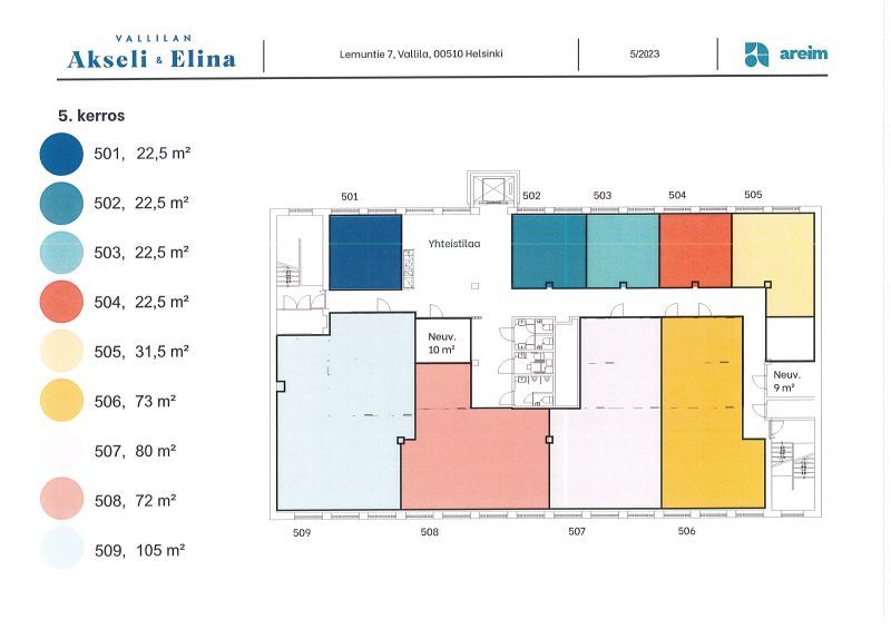5. kerroksen pientoimistotila 22,5 m² (pohjapiirustuksessa tilat 501, 503, 504).