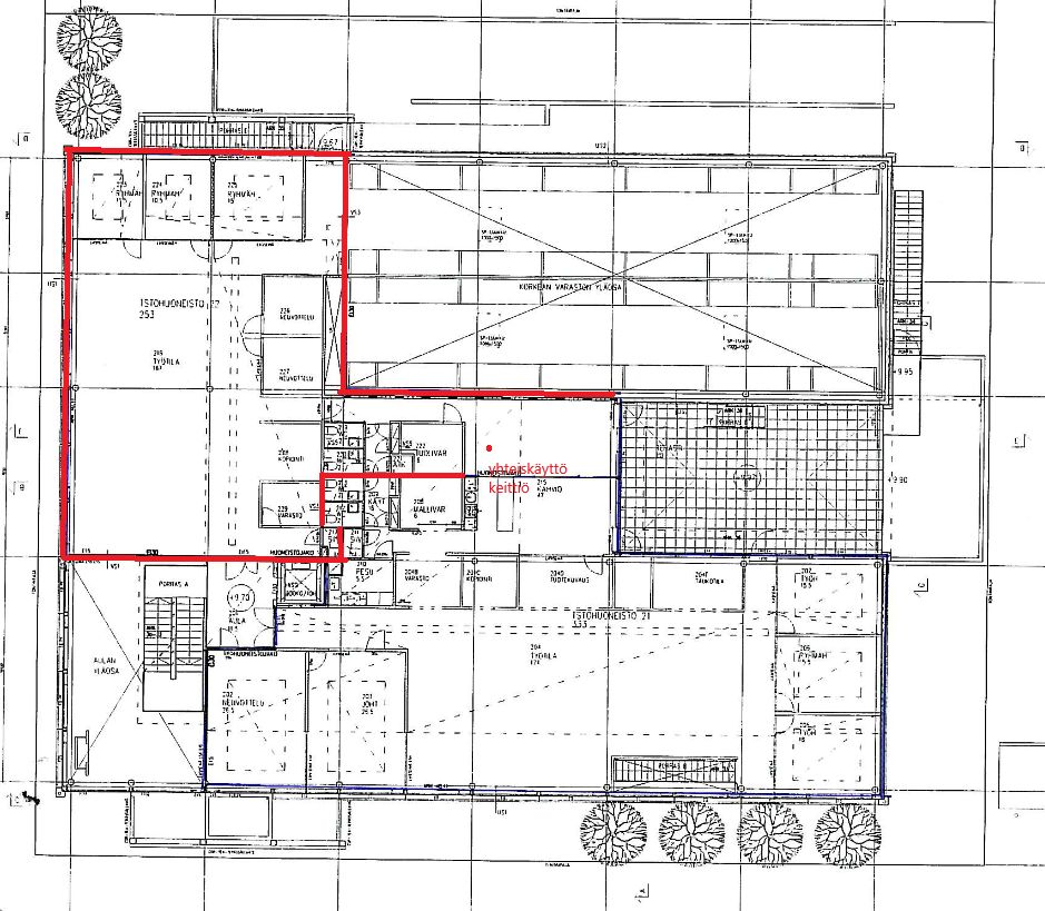 Vuokrattavana toisen kerroksen toimistotilaa yhteensä 253 m2 + 20 m2 yhteiskeittiö. Tilassa 3 + 2 huonetta muuten avotilaa. Iso keittiö / ruokailutila yhdessä viereisen tilan kanssa, 2 x wc. Käynti ulkoterassille. Tilaan pääsee myös hissillä.