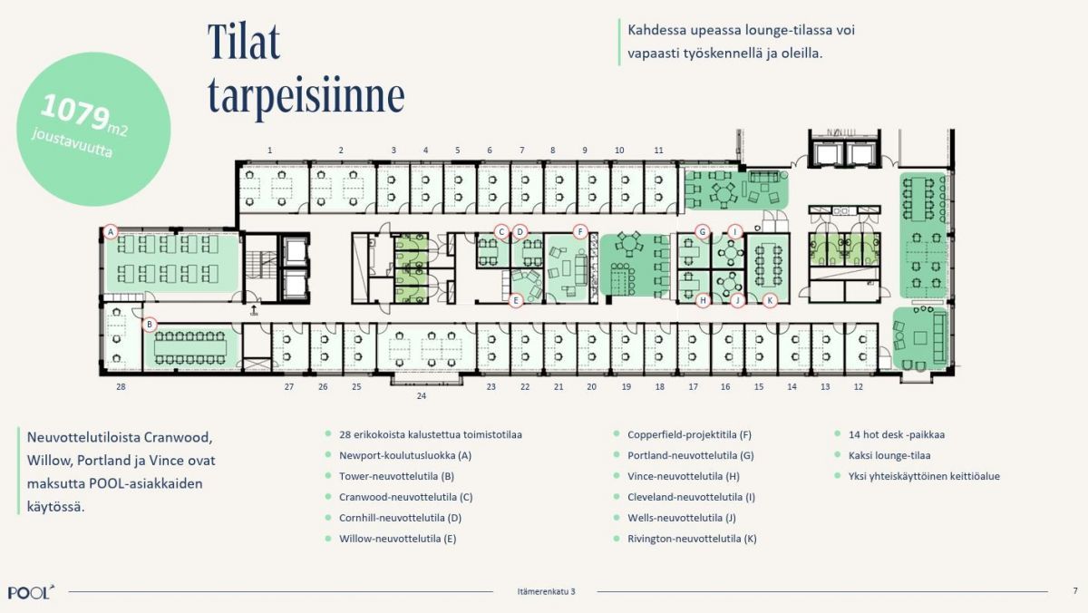 Vuokrataan juuri valmistuneita pientoimistoja huippusijainnilta Ruoholahdesta. Kaikki POOL Itämerenkatu 3:n pientoimistot ovat kalustettuja. Vuokraan sisältyy kaikki: WLAN-yhteys, sähkö, kahvi ja tee, yleisten tilojen ja pientoimistojen siivous sekä valittujen neuvottelu-, lounge- ja hotdesk-tilojen sekä yhteiskeittiön käyttö. Lisäksi POOL-asiakkaiden vuokraan sisältyy myös kohteen aulapalvelu, yleiset sosiaalitilat ja kuntosali.