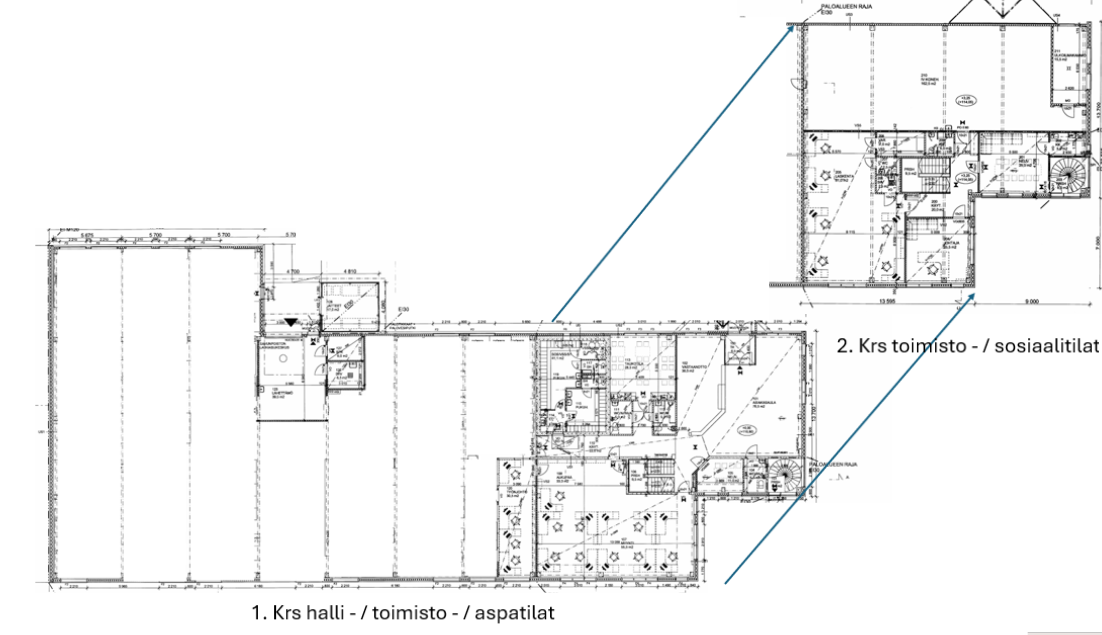 Hallitilaa kohteessa on katutasossa noin 900m2, ja hallitilan vapaa korkeus on n. 4 metriä. Nosto-ovellinen lähettämö-tila hallitilan yhteydessä, nosto-oven mitat n. 3 m x 3,5 m. Lisäksi kiinteistössä on kahdessa kerroksessa toimisto - / sosiaali- ja taukotilaa yhteensä noin. 650 m2. Autopaikkoja kiinteistöllä on noin 40 kappaletta. Kiinteistö on rakennettu 2000-luvulla, ja kiinteistössä on kaukolämpö.