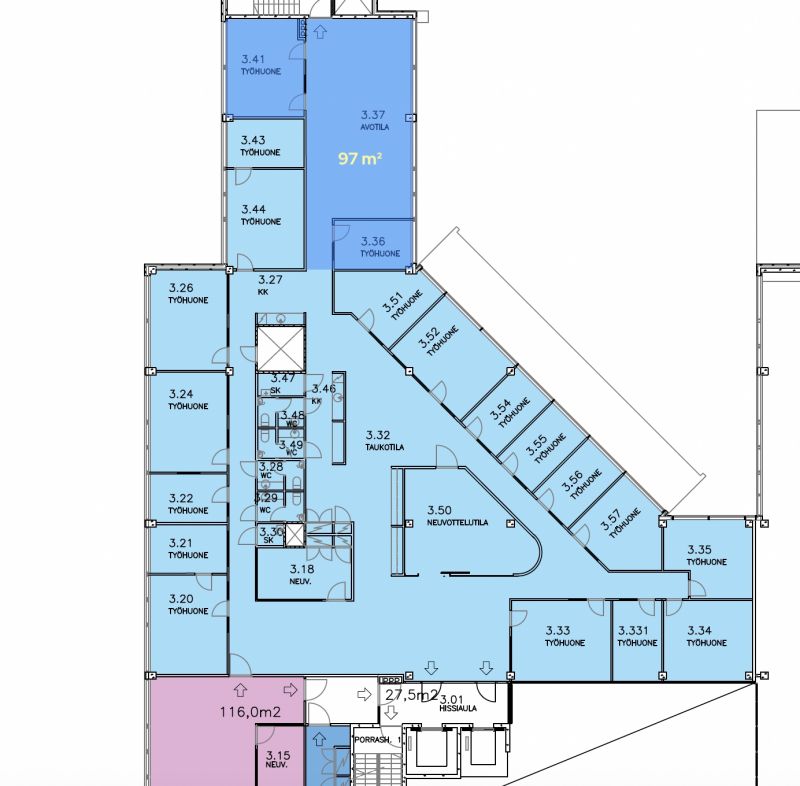 Toimisto vuokrattavana kolmannen kerroksen pientoimistoalueella Opus Business Parkissa. Alueen yrityksillä on yhteinen keittiö, wc-tilat ja ilmaisessa käytössä olevat kaksi neuvotteluhuonetta, joista lisätään jyvitys ilmoitettuun neliömäärään.
