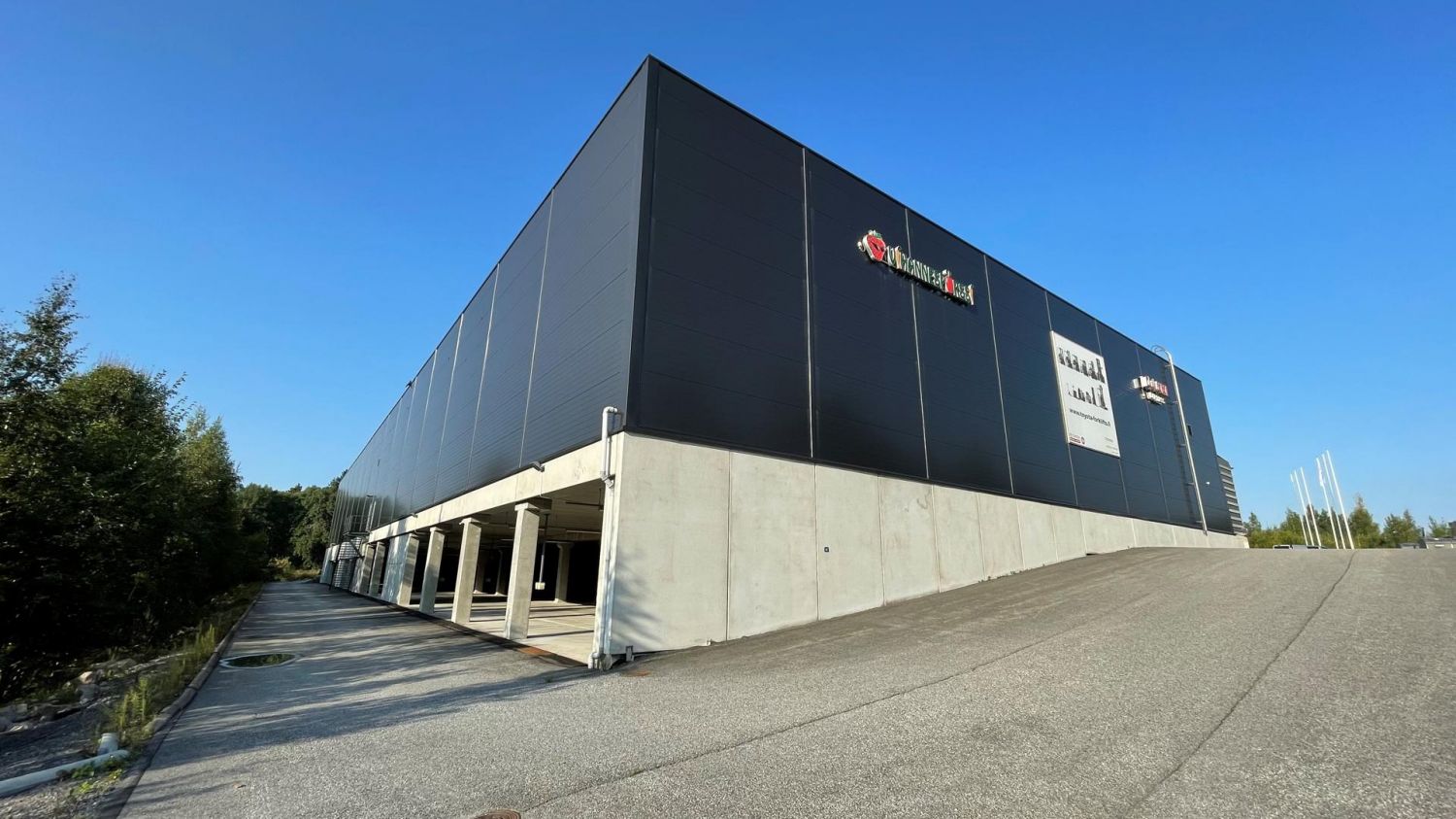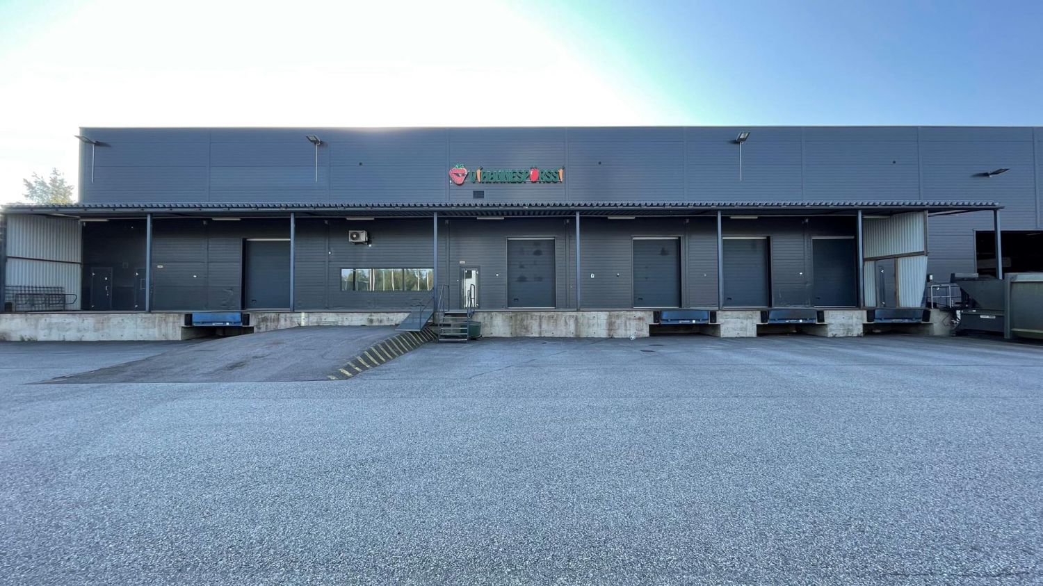 Lastauslaituri ja nosto-ovi. Katettua pysäköintitilaa rakennuksen alla.