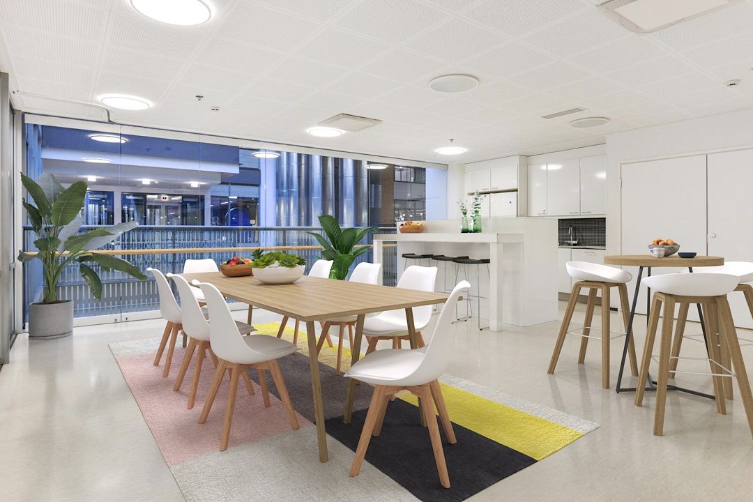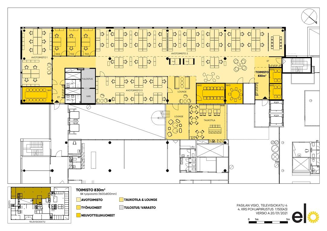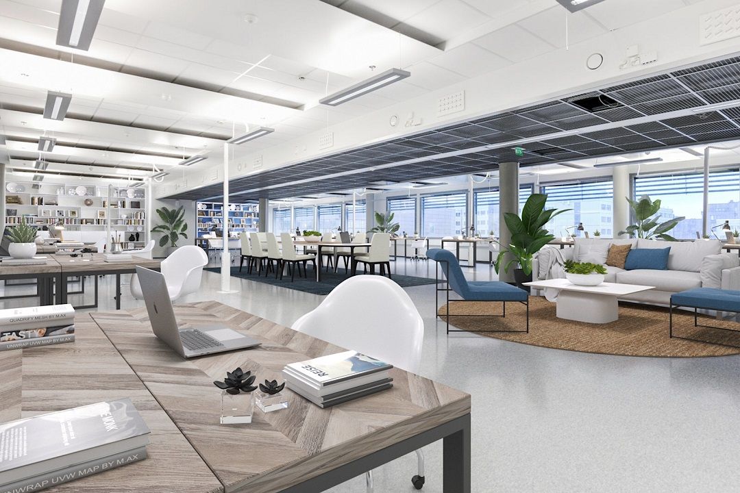 Neljännen kerroksen 830,5 m2 valoisa toimistotila, joka pääosin on avotilaa.